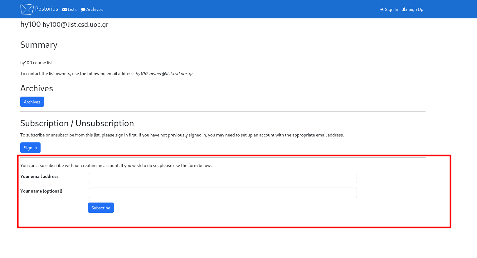 *.uoc.gr) και του*.forth.gr).Οι λίστες των μαθημάτων έχουν διαθέσιμο ιστορικό των επικοινωνιών πατώντας στο πάνω οριζόντιο menu την επιλογή Archives ή ακολουθώντας αυτό το σύνδεσμο https://lists.csd.uoc.gr/hyperkitty/
